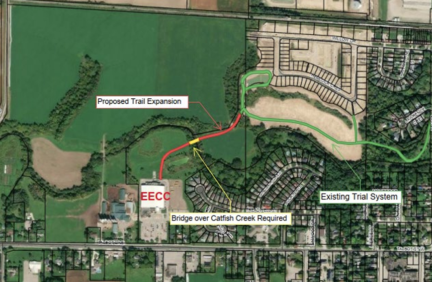 The 2026 trail expansion project is planned to extend the multi-use pathway at Willow Run/Rotary Park to the East Elgin Community Complex (EECC). The project will link the existing multi-use trail system in the southwest corner of Aylmer to the EECC. The project will provide a continuous multi-use pathway system from Talbot Street (EECC), through Town to Steen Park (2.65 km). The pathway project will comprise of approximately 370 m of new 3.0 m wide asphalt multi-use path. A bridge over Catfish Creek will also be required to complete the connection. The initiation of the project will require a topographic survey and detailed design for the proposed pathway and bridge. Boundaries will also have to be considered for the construction of this path since part of it is shared with Malahide.The trail expansion designs have been included for 2026 and can entirely be funded from Development Charge (DC) reserves since there is money in those reserves and since these projects would be entirely growth related.