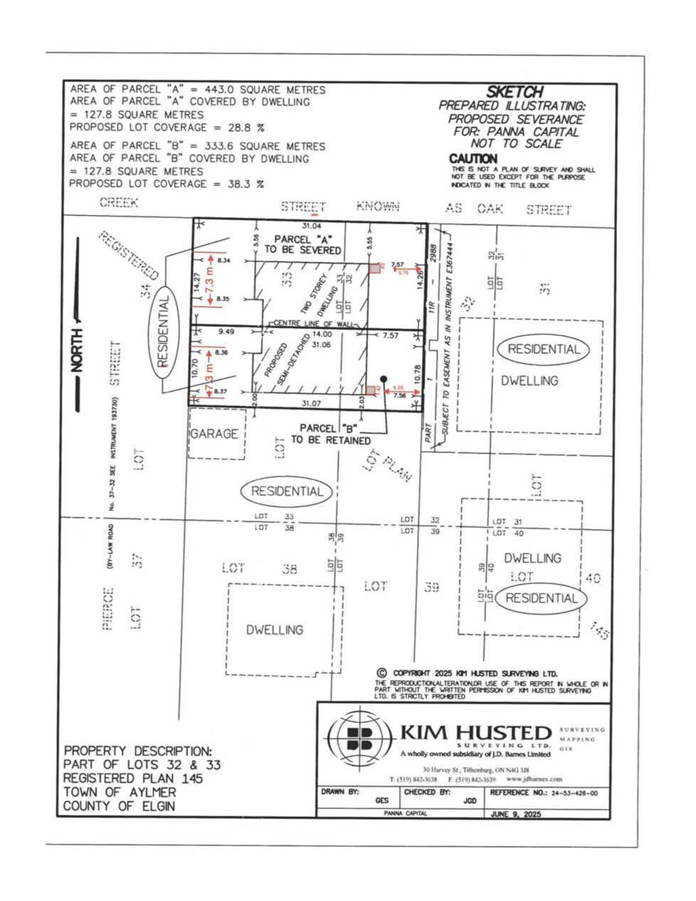 The subject lands are located within the Low Density Residential land use designation of the Town of Aylmer Official Plan. The subject lands are also zoned Residential Type 2 (R2) in the Town of Aylmer Comprehensive Zoning By-law No. 57-99. A semi-detached residential building is currently under construction on the subject lands (outlined in yellow on the back of this notice) and the parcels are identified as Parcel A and Parcel B on the attached sketch. The owner is proposing to sever the semi-detached units for individual ownership.